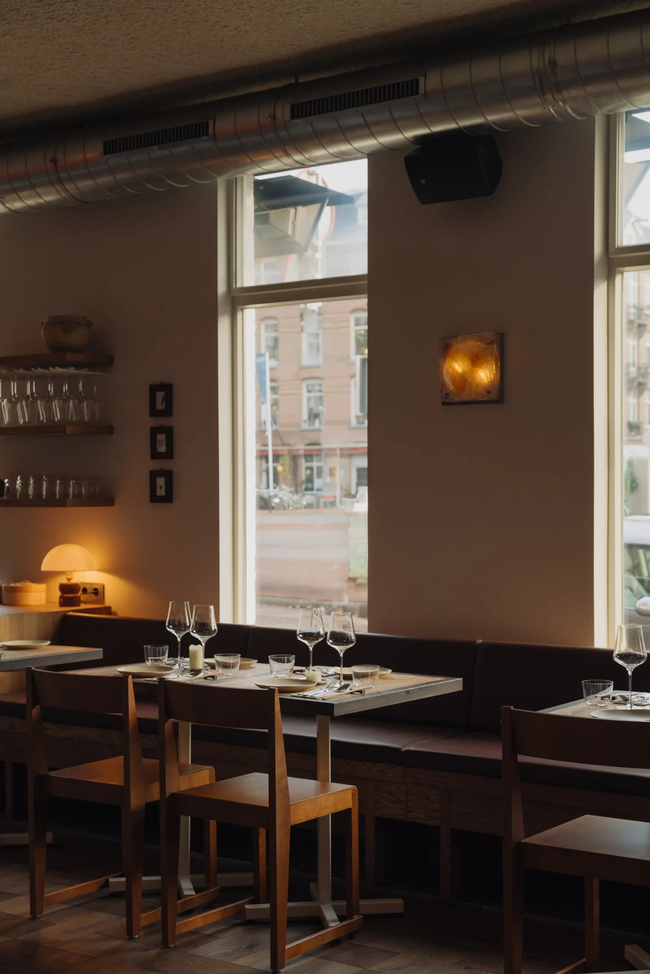 Hanging above the DJ booth is a spherical 3D-printed pendant lamp, created in collaboration with Design Academy Eindhoven alumnus Jasper van der Burgh – giving emerging design talent a platform.