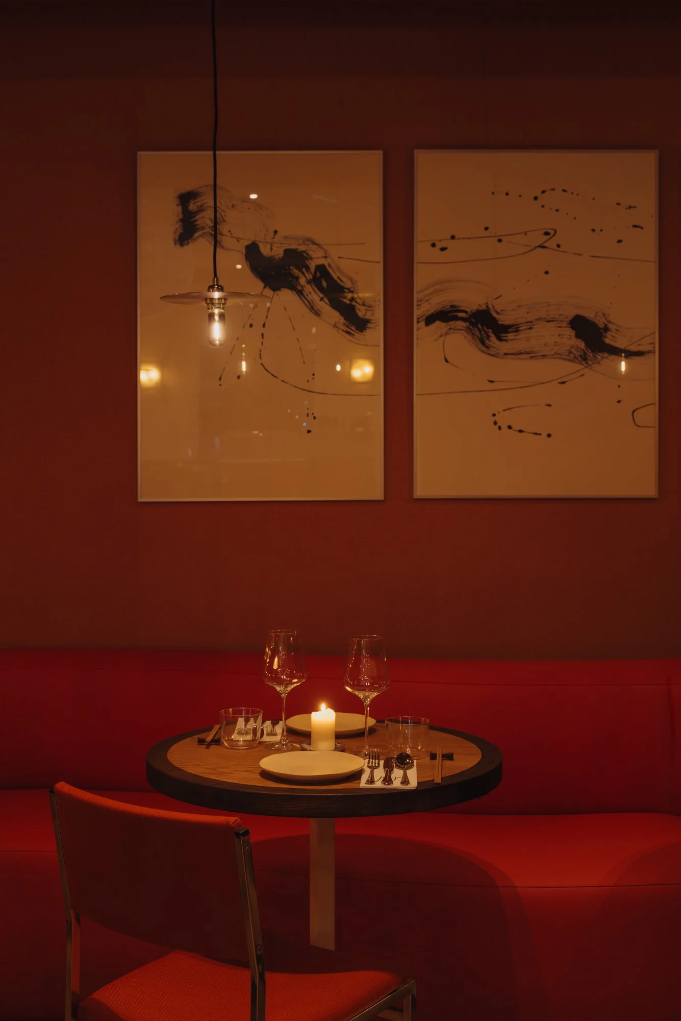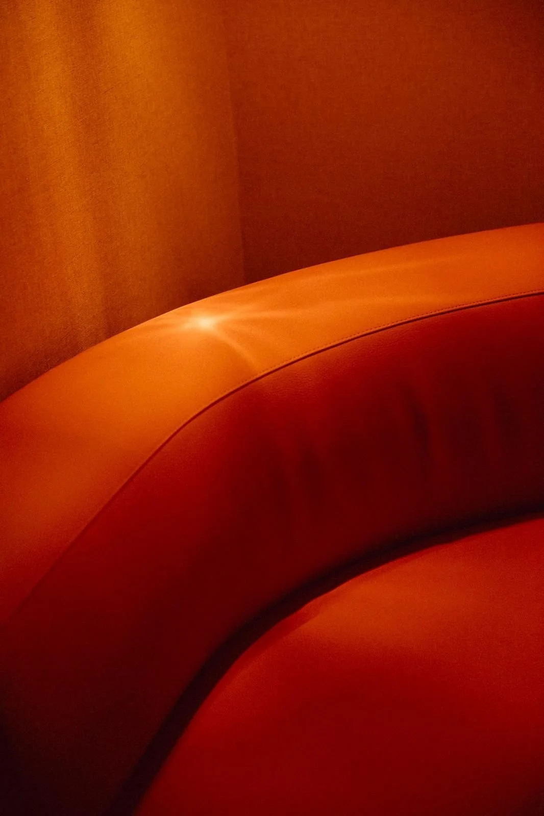 A 17-meter-long undulating orange banquette energizes the space and adds a sense of movement. Above the banquette hang custom art pieces by Christiaan van Lennep which accentuate its fluidity, creating a harmony of motion.