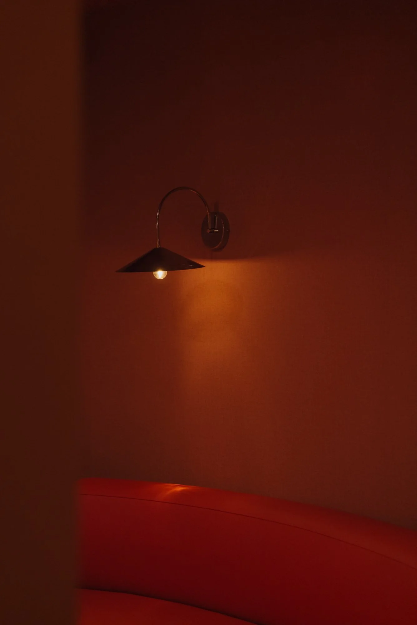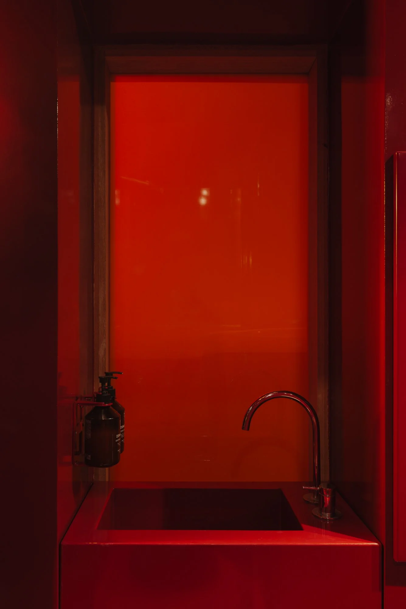 Restrooms are colour-drenched in deep red, from the vanity to the toilets, to give the space a seductive edge – amplified by a mirrored ceiling.