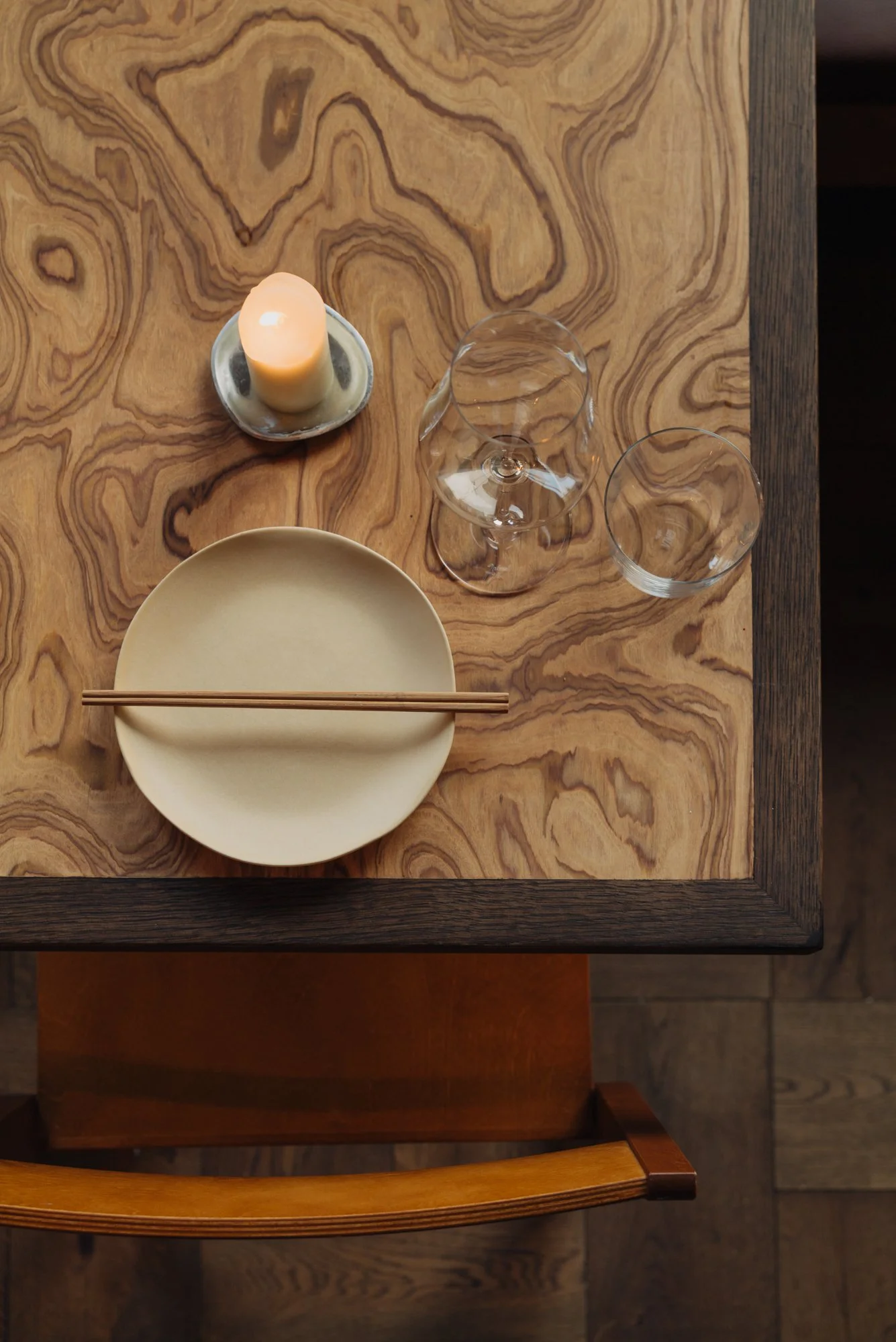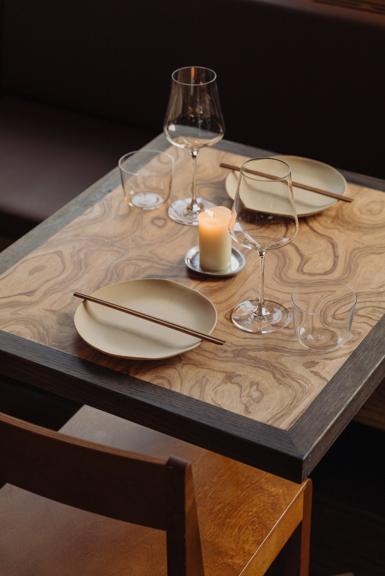 Natural materials are allowed to shine, with custom tables crafted from light and dark oak with burl veneer.