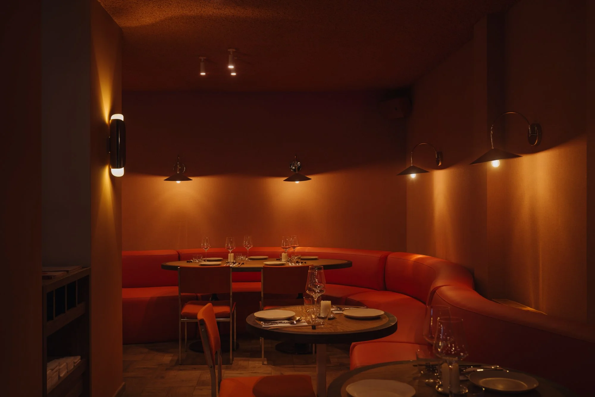 The crisp, angular bar interacts with the soft lighting above, where lamps are draped in orange fabric to create a unique statement.